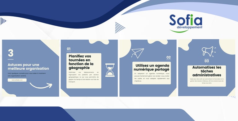 Ce projet pour Sofia Développement illustre comment le design de l'information peut réduire la charge cognitive pour l'utilisateur. En utilisant une palette de bleus apaisants et une typographie sans-serif très lisible, ce carrousel transforme des processus administratifs souvent perçus comme lourds en une série de solutions simples et désirables.