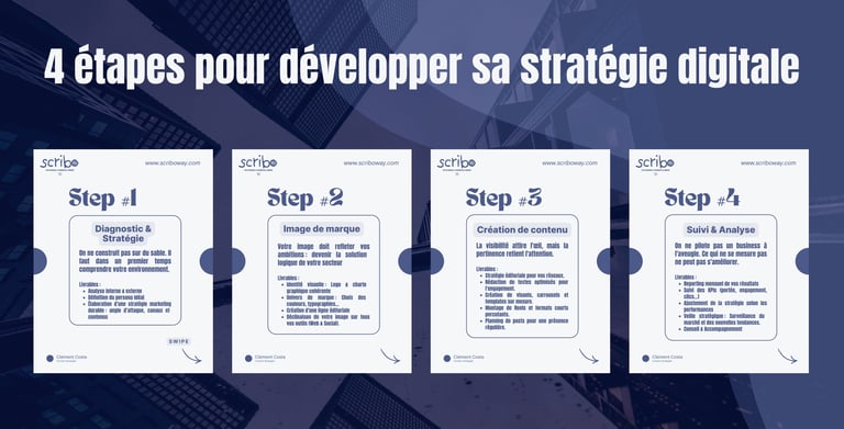 Réalisation pour Scribo mettant en avant une méthodologie pas à pas. Ce design privilégie une hiérarchie visuelle forte et un style épuré, idéal pour ce type de contenu. Chaque montage est pensée pour maximiser le taux de rétention et inciter au passage à l'action.
